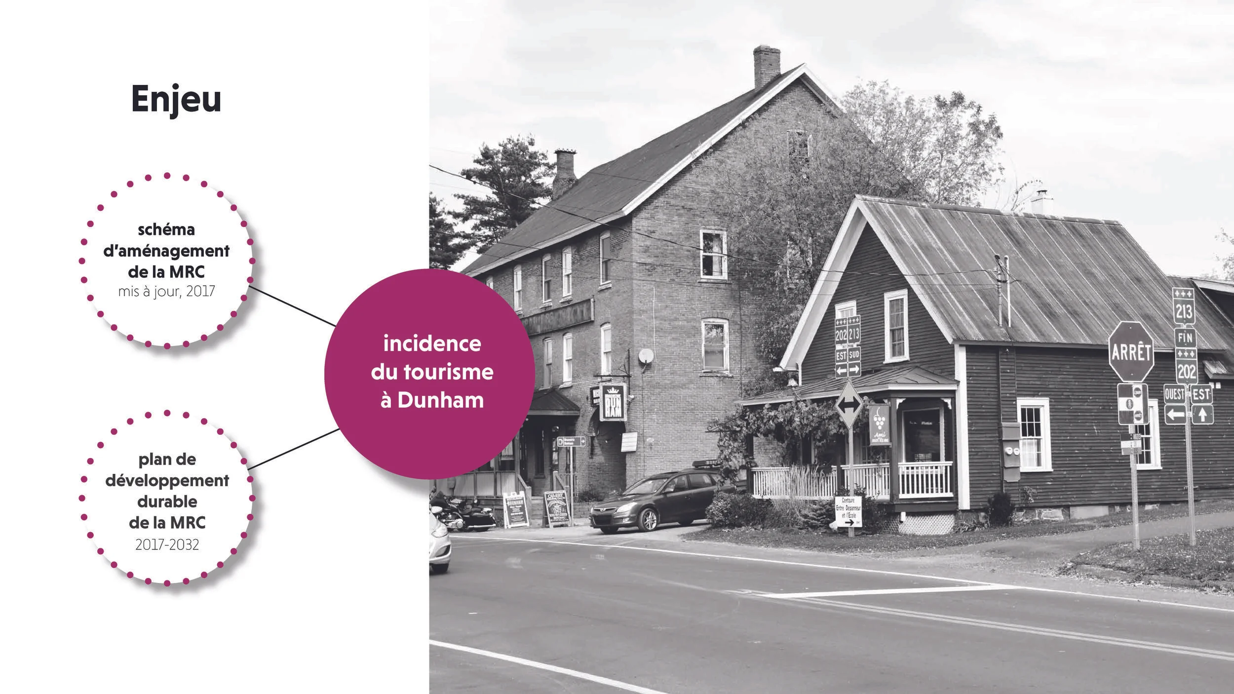 Des constats développés dans une première lecture sensible du paysage de Dunham nous a permis de relever le fait que de nombreuses expressions du tourisme se figurait sur le noyau villageois de Dunham, et ce, à travers des observations in-situ de ses composantes paysagères, de l’identification des grandes affectations du sol et des différentes activités qu’offre le territoire. L’ensemble nous a permi de nous pencher sur un enjeu principal soit celui “ de l’incidence du tourisme sur le noyau villageois” qui prennent appui sur les champs prioritaires du plan stratégique de développement durable 2017-2032 de la MRC et de son schéma d’aménagement et de développement.