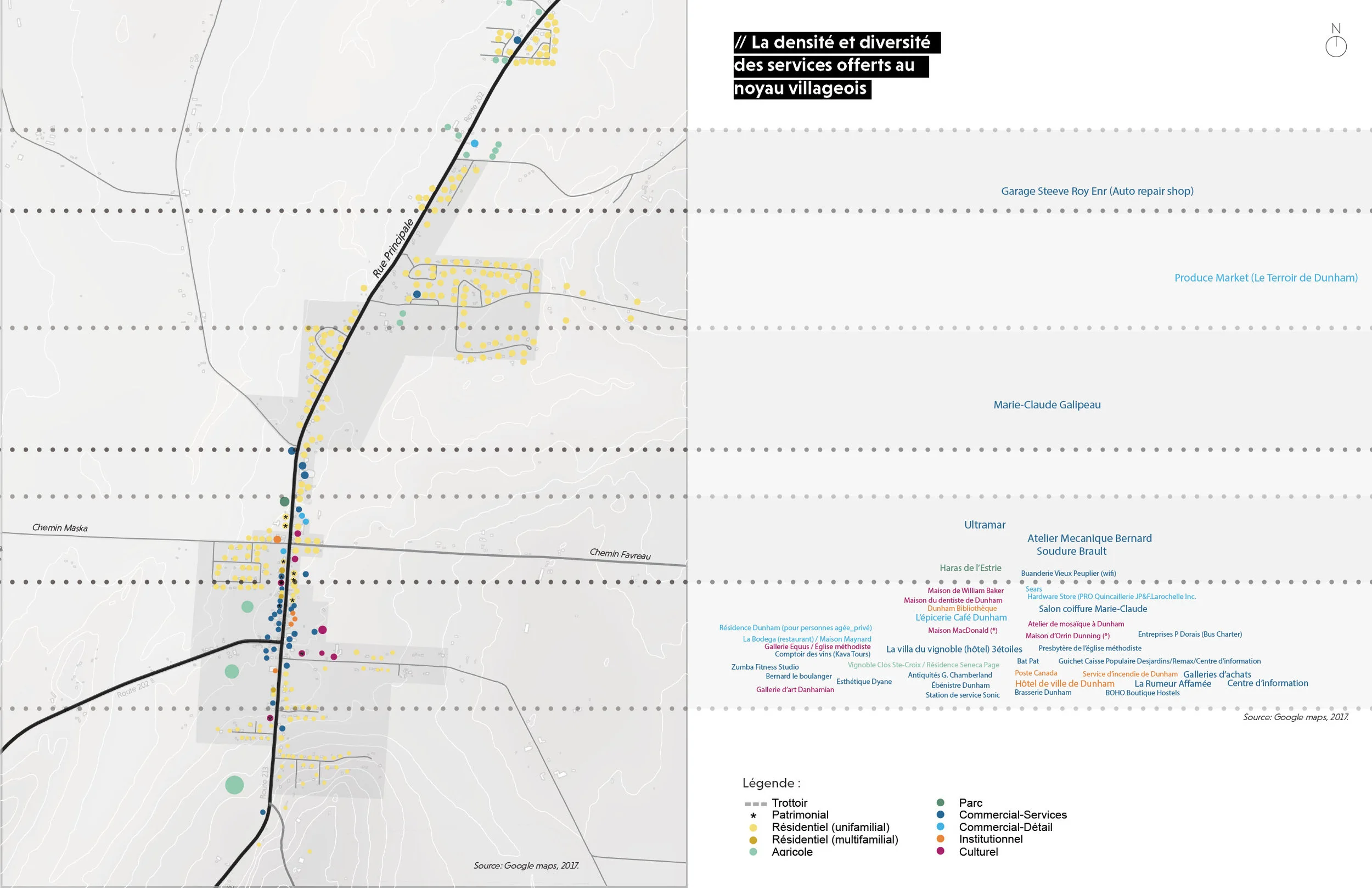 Une caractérisation des dynamiques économiques du noyau villageois de Dunham nous mène à conclure qu'une diversité dynamique de services se concentrent sur le noyau villageois de Dunham. Ils sont localisés sur la rue principale soit sur la route 202.